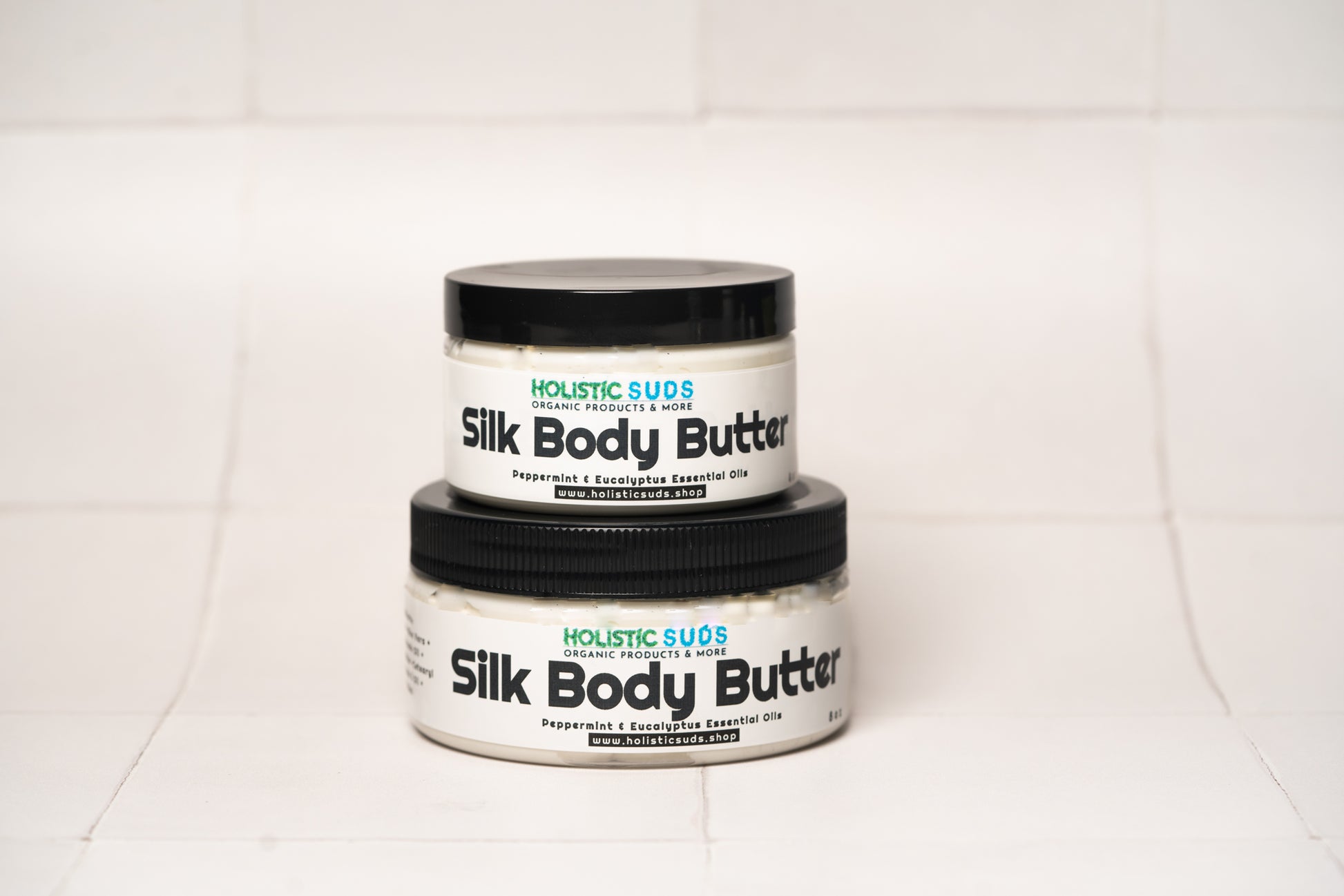 It absorbs right into your skin and keeps it Soft, Hydrated and Moisturized All Day long. The celebrated ingredients in our Silk Body Butter product is Shea Butter, Aloe Vera, Vitamin E Oil and Avocado Oil.